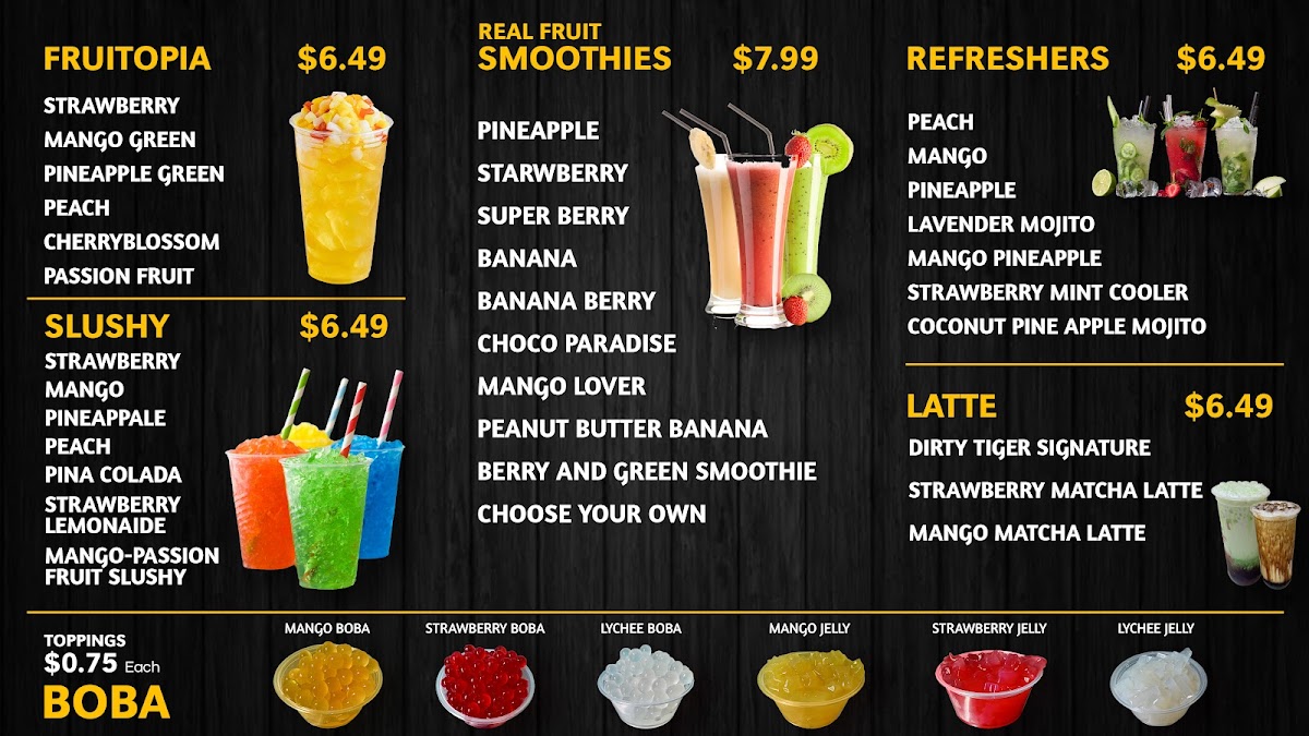 The menu features a selection of real fruit smoothies, each richly flavored and served chilled, making them ideal for warm afternoons or when you want something both satisfying and refreshing. For those seeking something a little more indulgent or cool, the slushies provide bright, icy options, often enjoyed as a fun pause from the day’s activities.